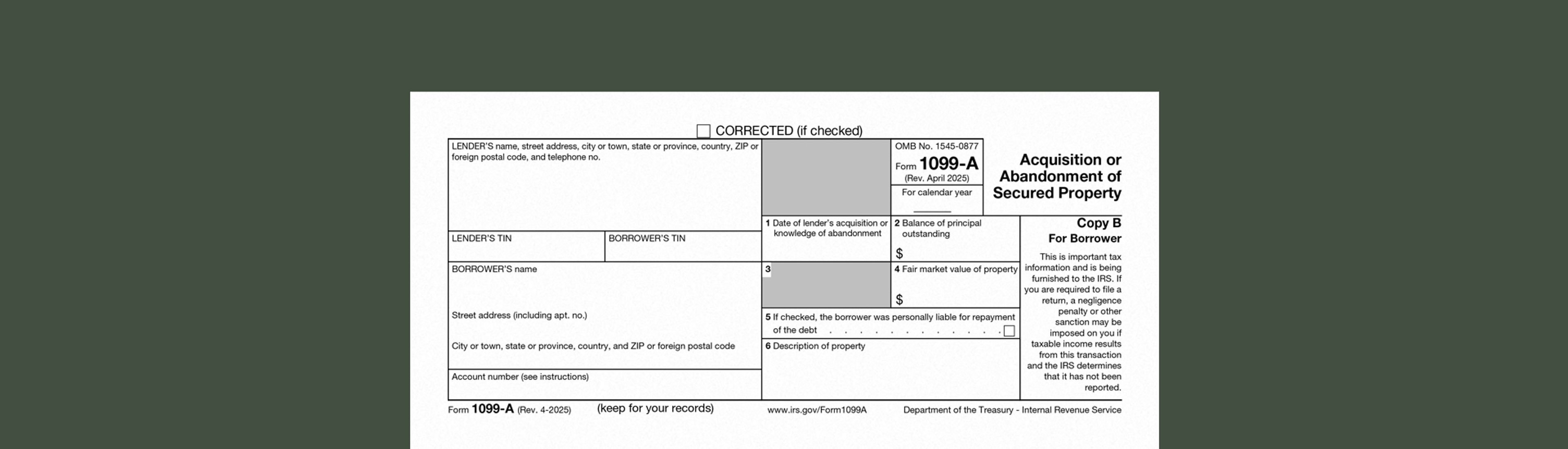 Whenever a bank or lender acquires property used to secure a loan through foreclosure or repossession, they’re required to file a copy of Form 1099-A (Copy A) with the IRS, and a second copy with the borrower (Copy B).