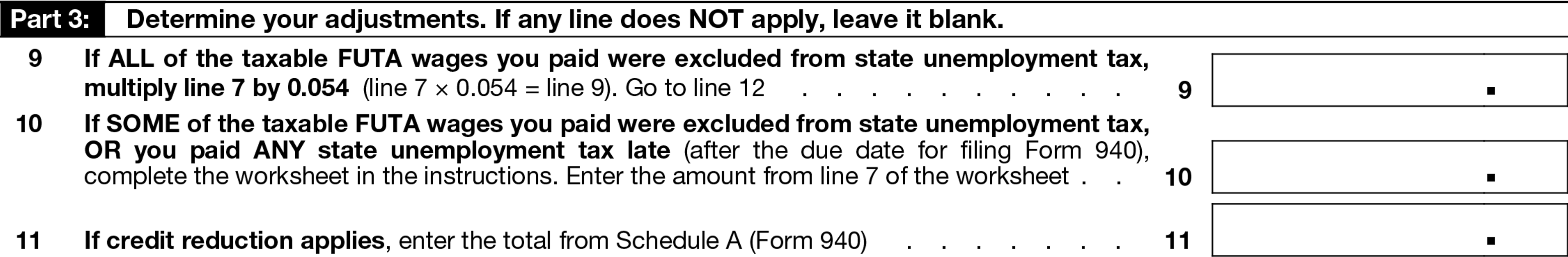 If all of the FUTA wages you paid were excluded from state unemployment tax, multiply the amount on Line 7 by 0.054 and record the resulting amount on Line 9. (This line isn’t applicable if your state assigned you an employer rate of 0%.)