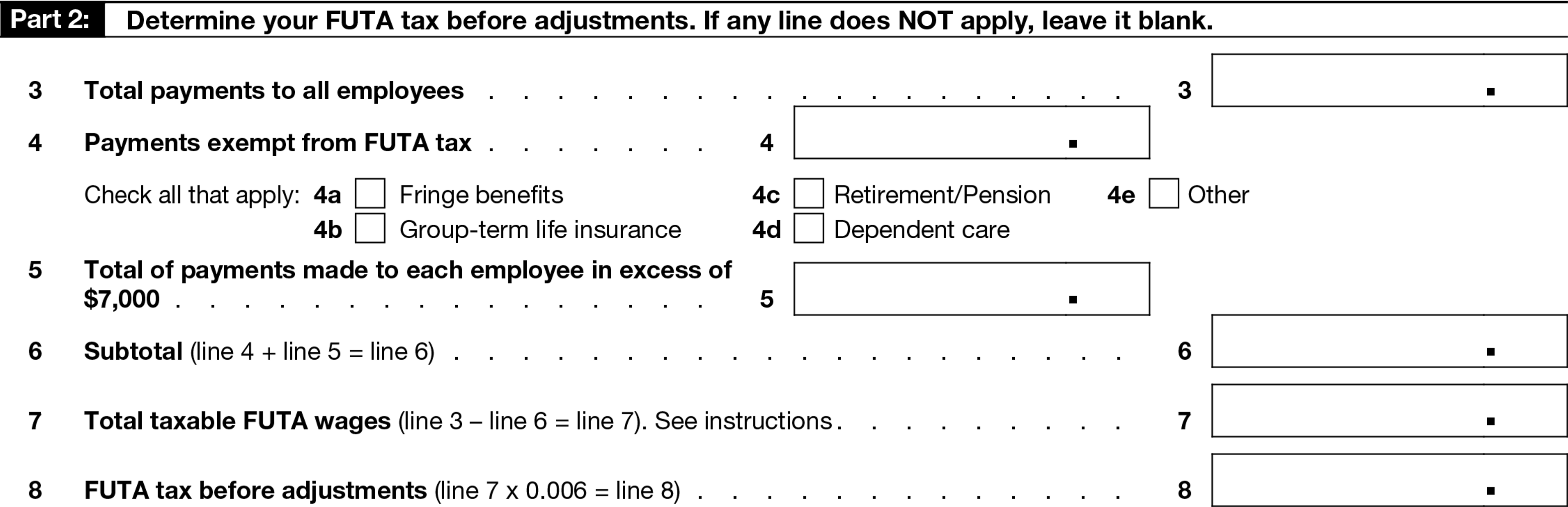 Only the first $7,000 of wages for each employee is subject to FUTA tax, and amounts over $7,000 paid to each employee can be subtracted from total payments on Line 3. Any amount over $7,000 paid to each employee is recorded on Line 5.