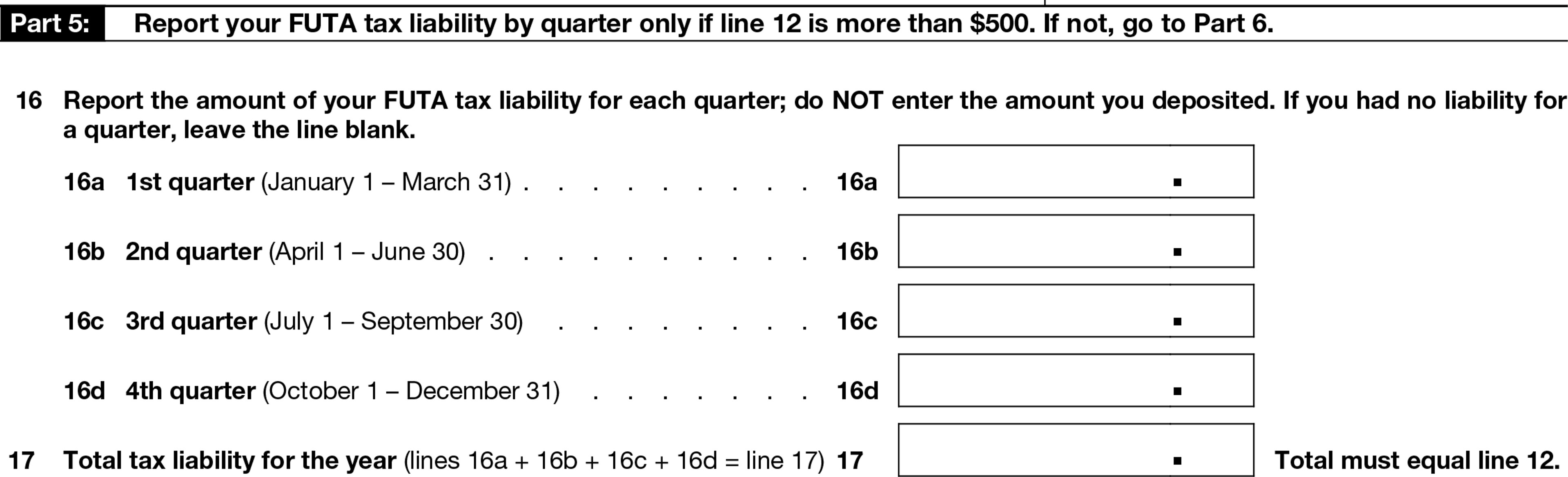 In this section you’ll report your FUTA tax liability for each quarter if the total amount reported on line 12 is more than $500. If it isn’t, skip this section.
