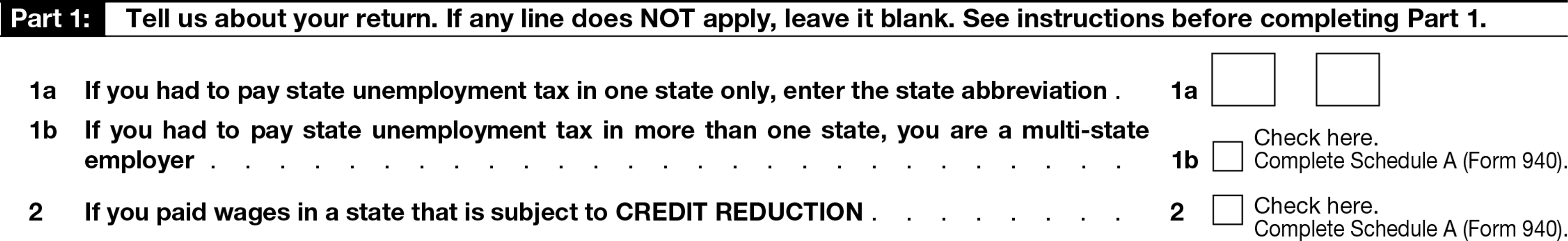 If you’re a multi-state employer and/or you paid wages in a credit reduction state, you’ll have to complete and attach Schedule A (Form 940).