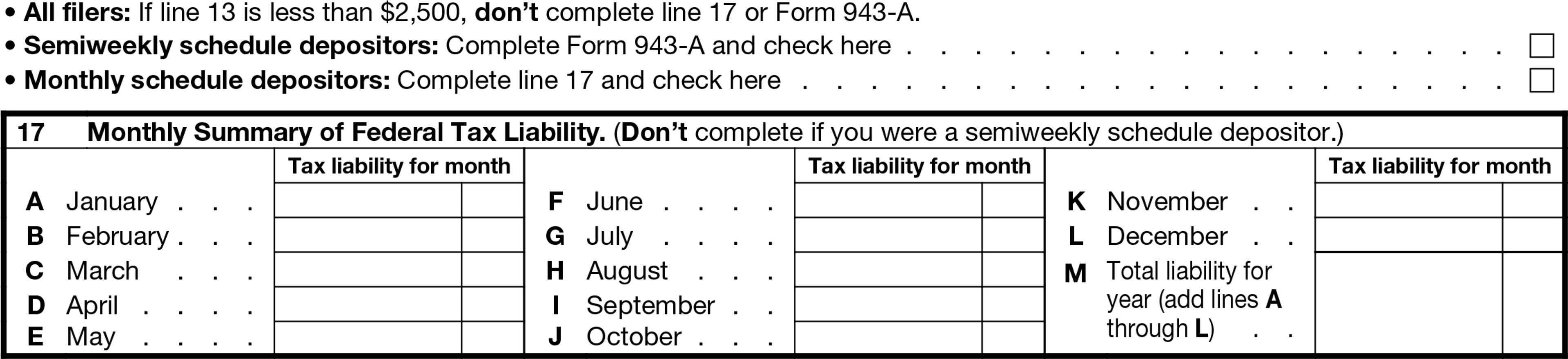 Line 17. This section is where you enter a month-by-month breakdown of payroll taxes you deposited to the IRS over the course of the year. Consult your deposit records to find the total amount for each month.